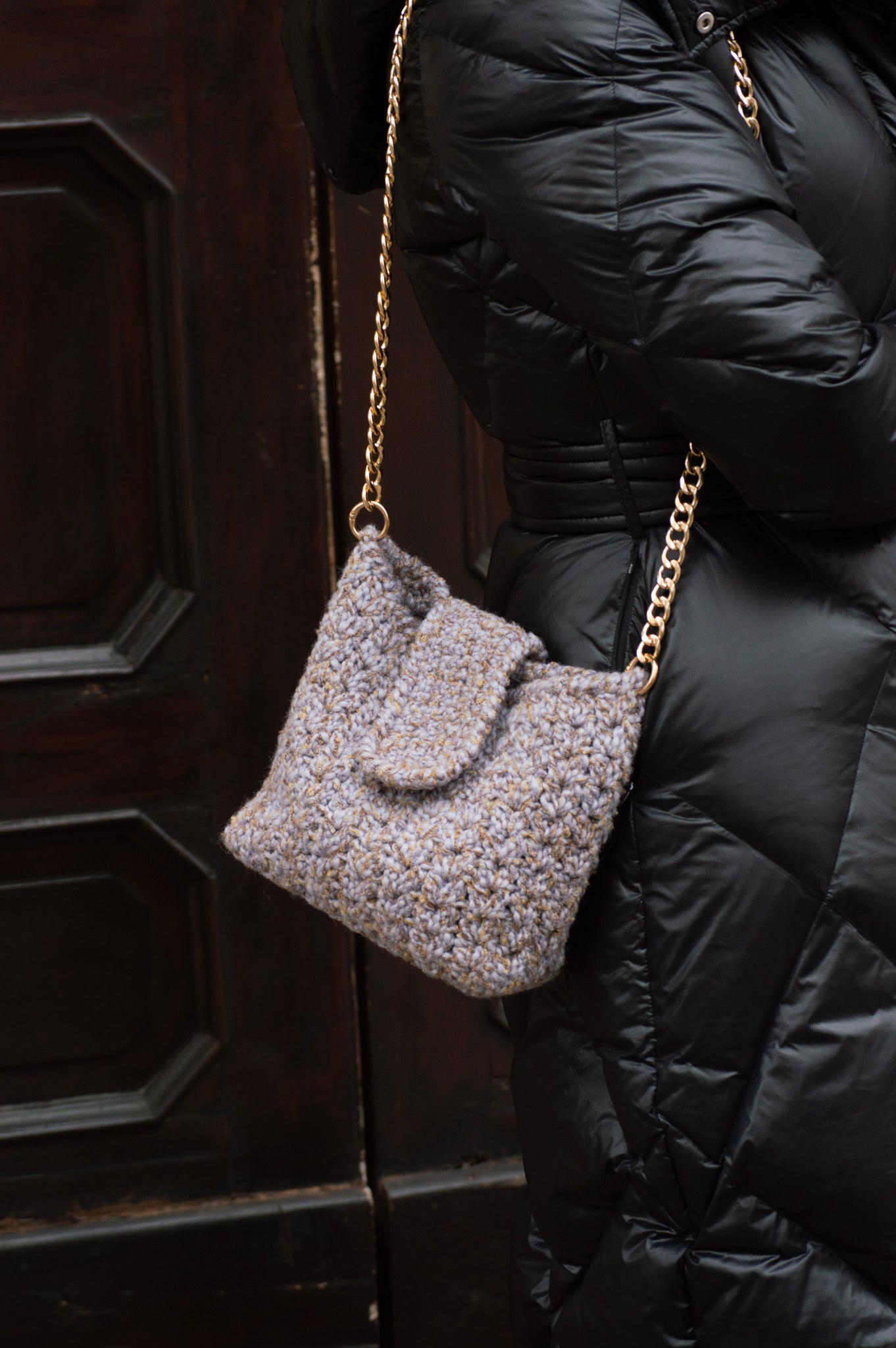 MATERIAL: wool, with leather bottom, gold metal chain, two gold metal rings, closure with a magnetic button
