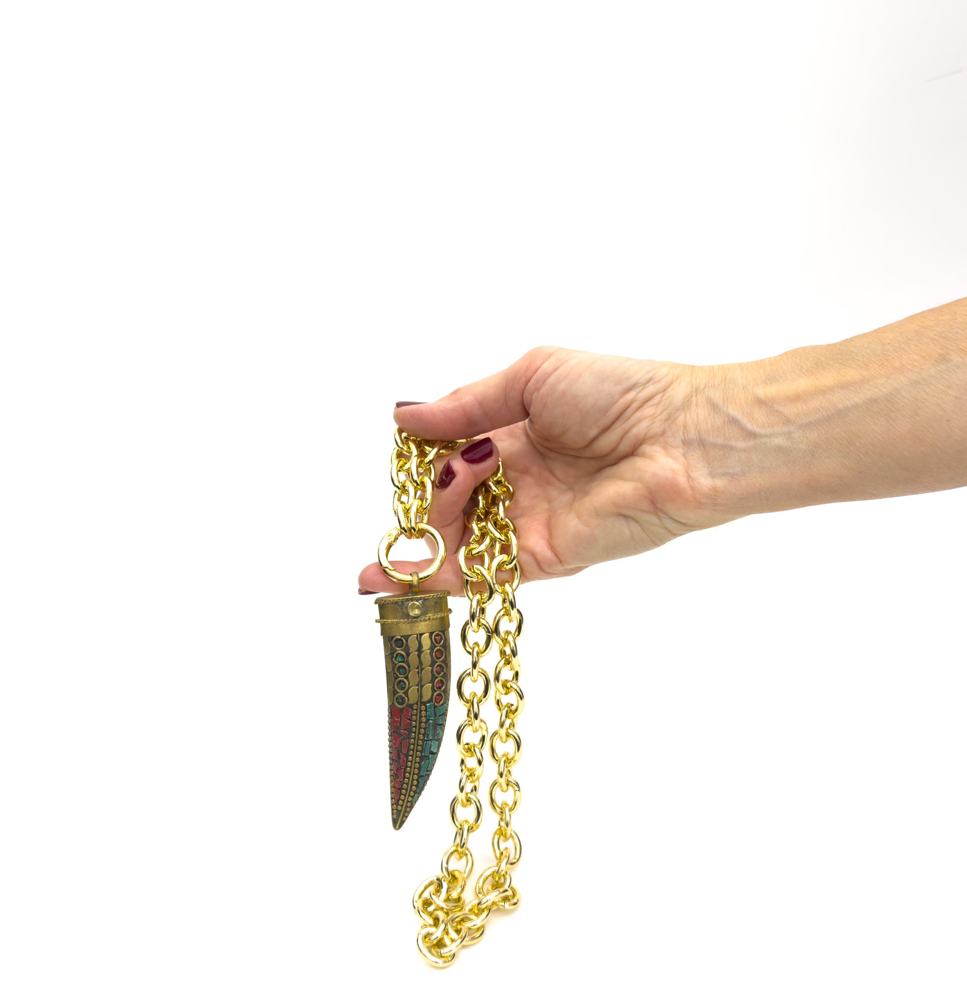MATERIAL: Gold metal horn with stone inserts, small studs, and metal inserts. Gold metal chain and gold metal ring.