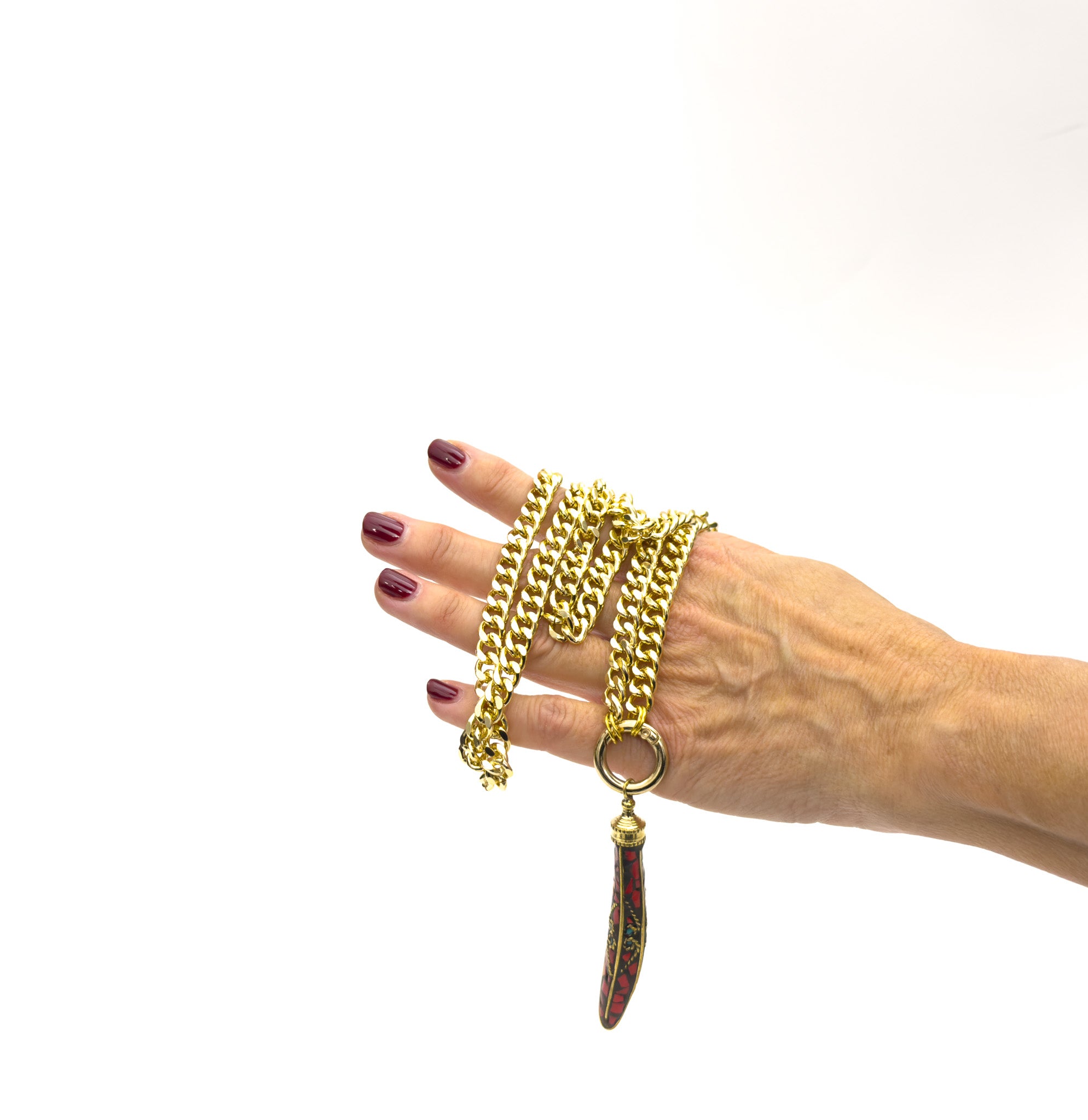 MATERIAL: Stones and metal studs dipped in hard resin, gold metal chain and gold metal ring