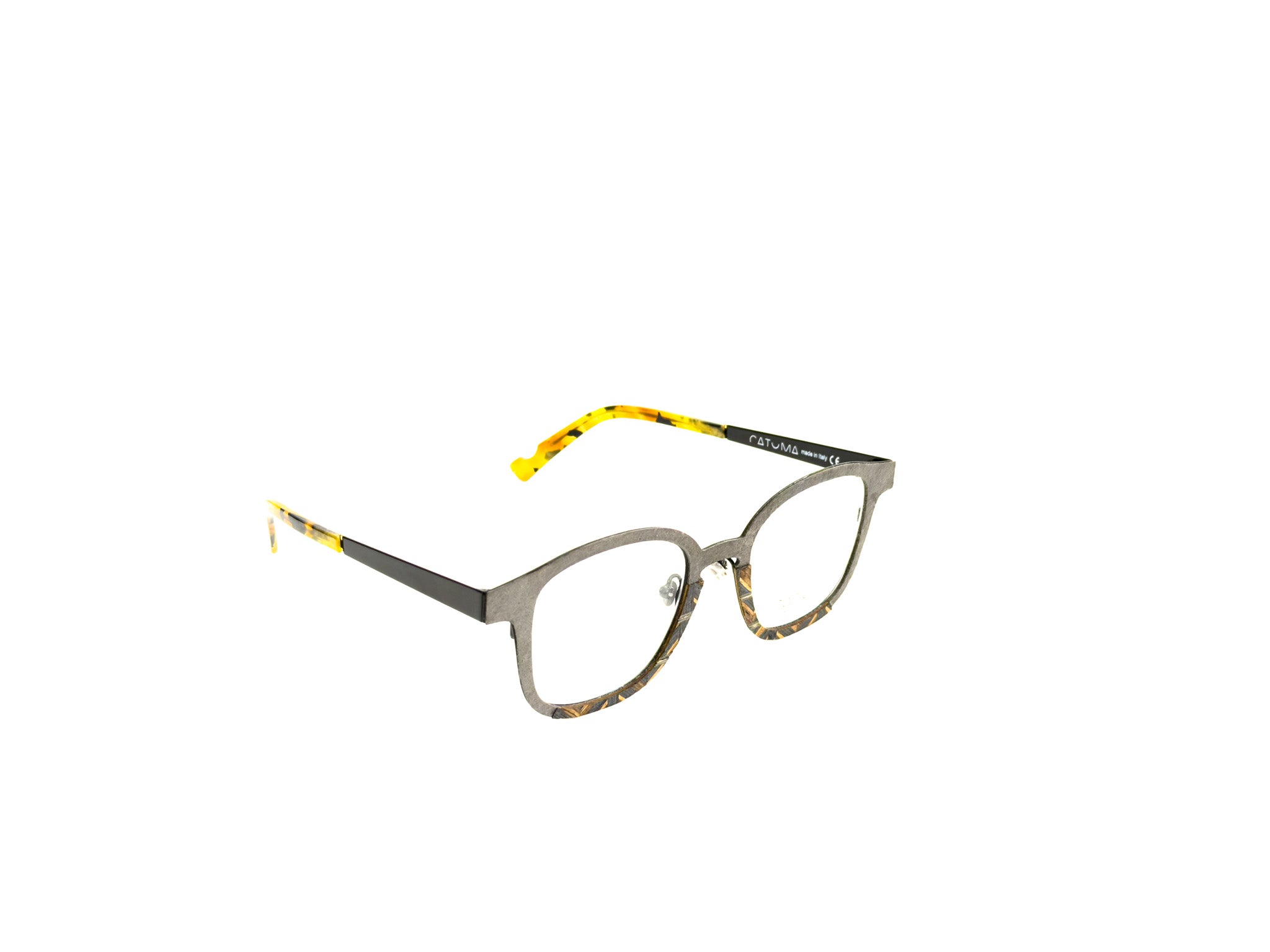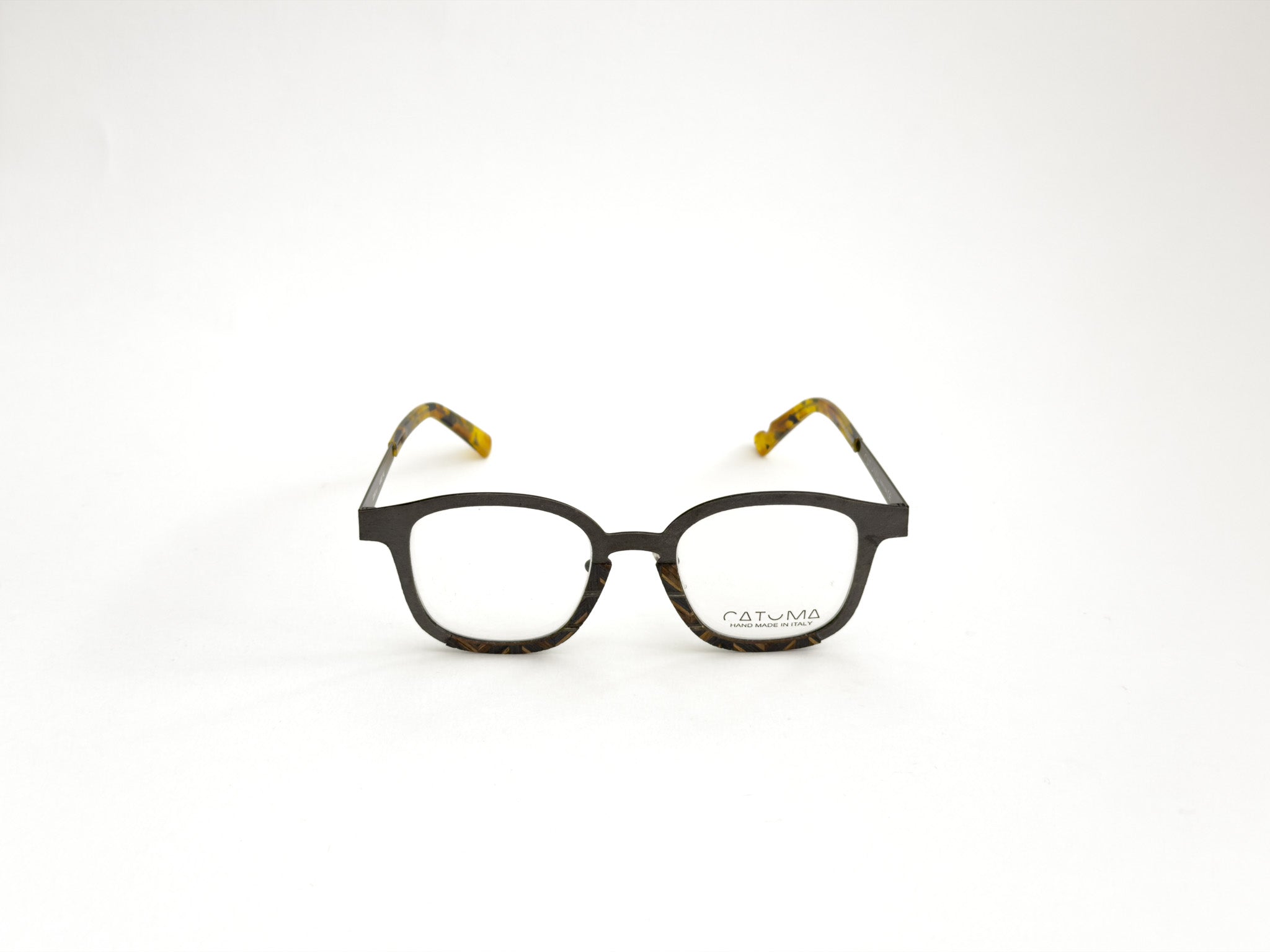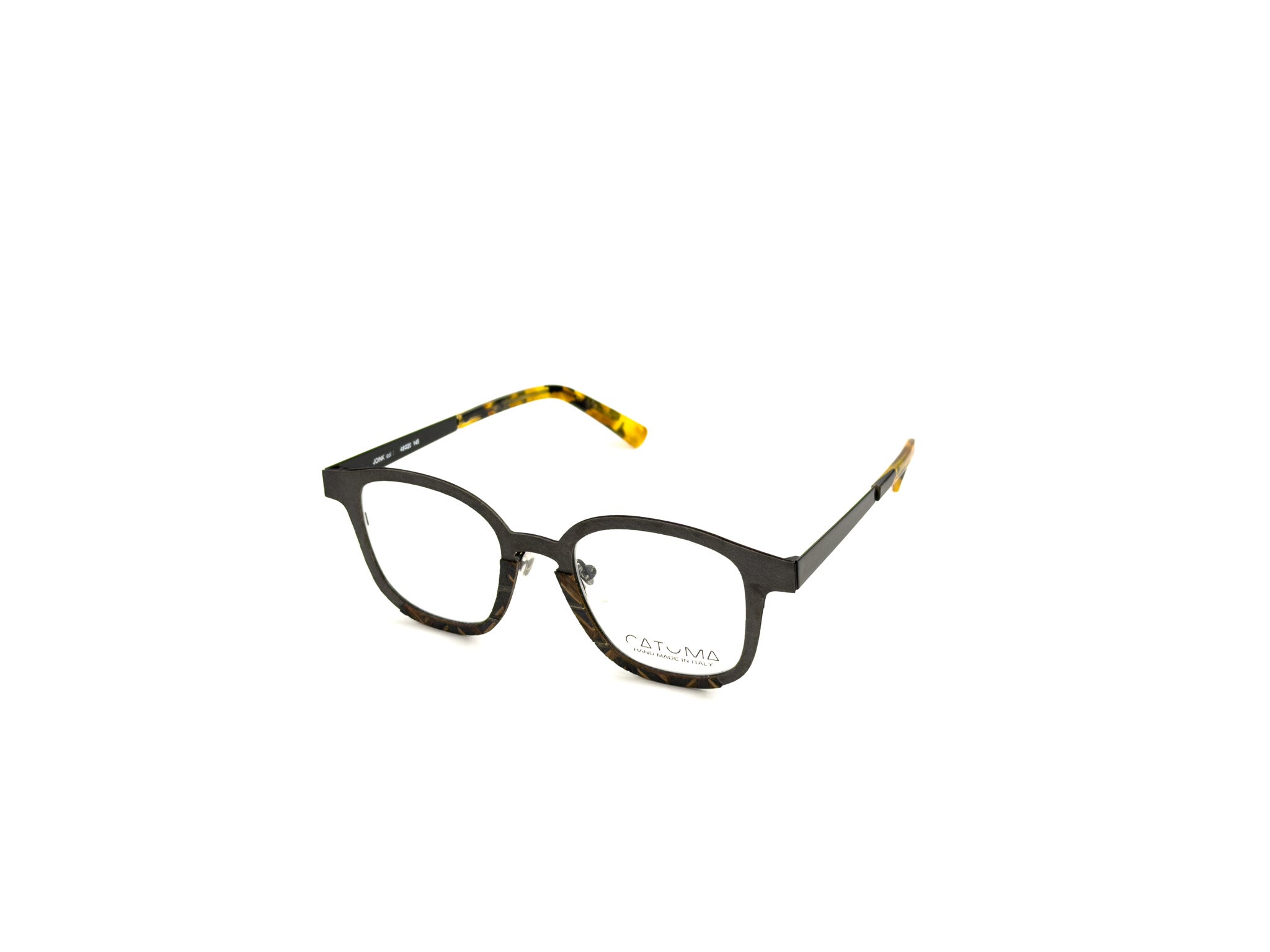 DESCRIPTION: Catuma frames are born from the encounter between natural materials and artisanal art. Stone, wood, carbon fiber, and steel blend in a perfect balance of contrasts and harmonies, giving life to frames that feel like small wearable works of art. Each pair of glasses is handcrafted with meticulous care, where every detail speaks of a passion for excellence. The result is a unique accessory, with a bold and refined character, that celebrates the beauty of natural imperfection and the magic of true Italian craftsmanship.