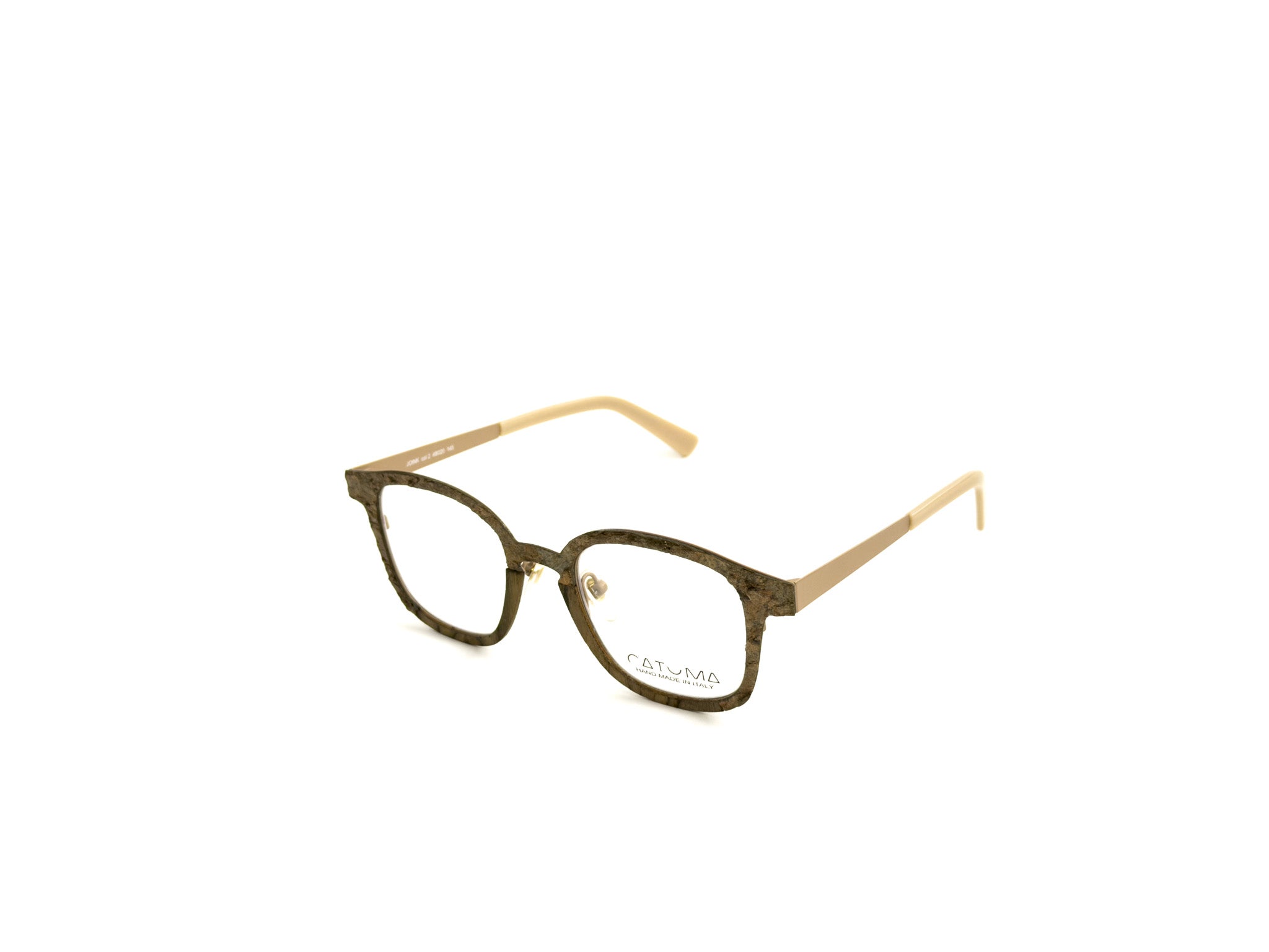 DESCRIPTION: Catuma frames are born from the encounter between natural materials and artisanal art. Stone, wood, carbon fiber, and steel blend in a perfect balance of contrasts and harmonies, giving life to frames that feel like small wearable works of art. Each pair of glasses is handcrafted with meticulous care, where every detail speaks of a passion for excellence. The result is a unique accessory, with a bold and refined character, that celebrates the beauty of natural imperfection and the magic of true Italian craftsmanship.