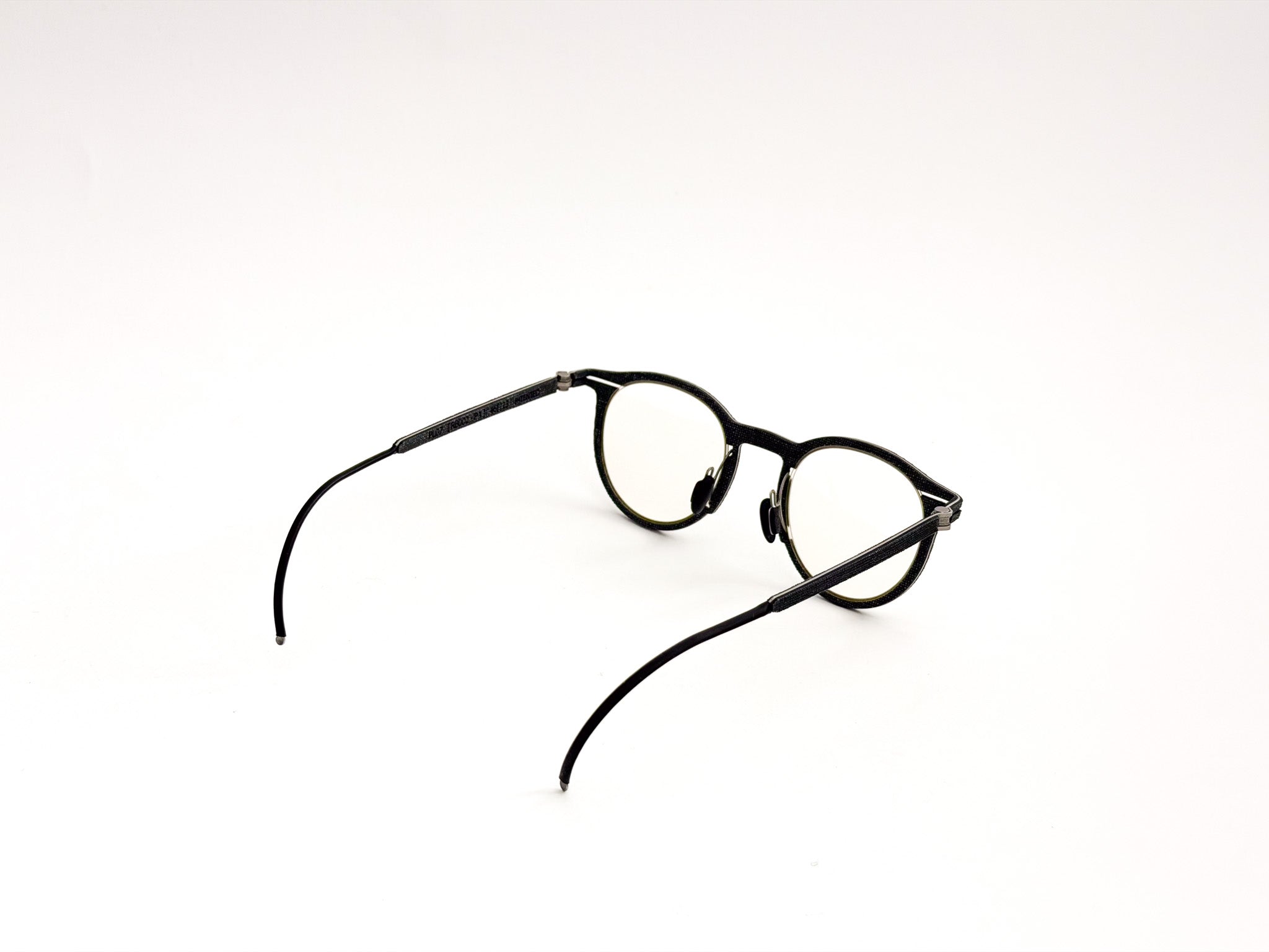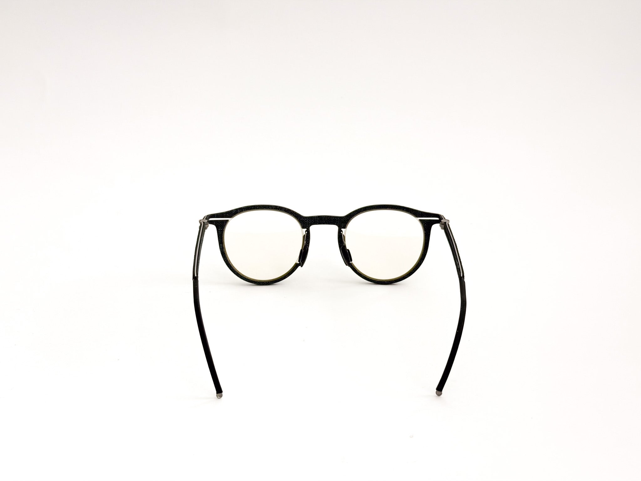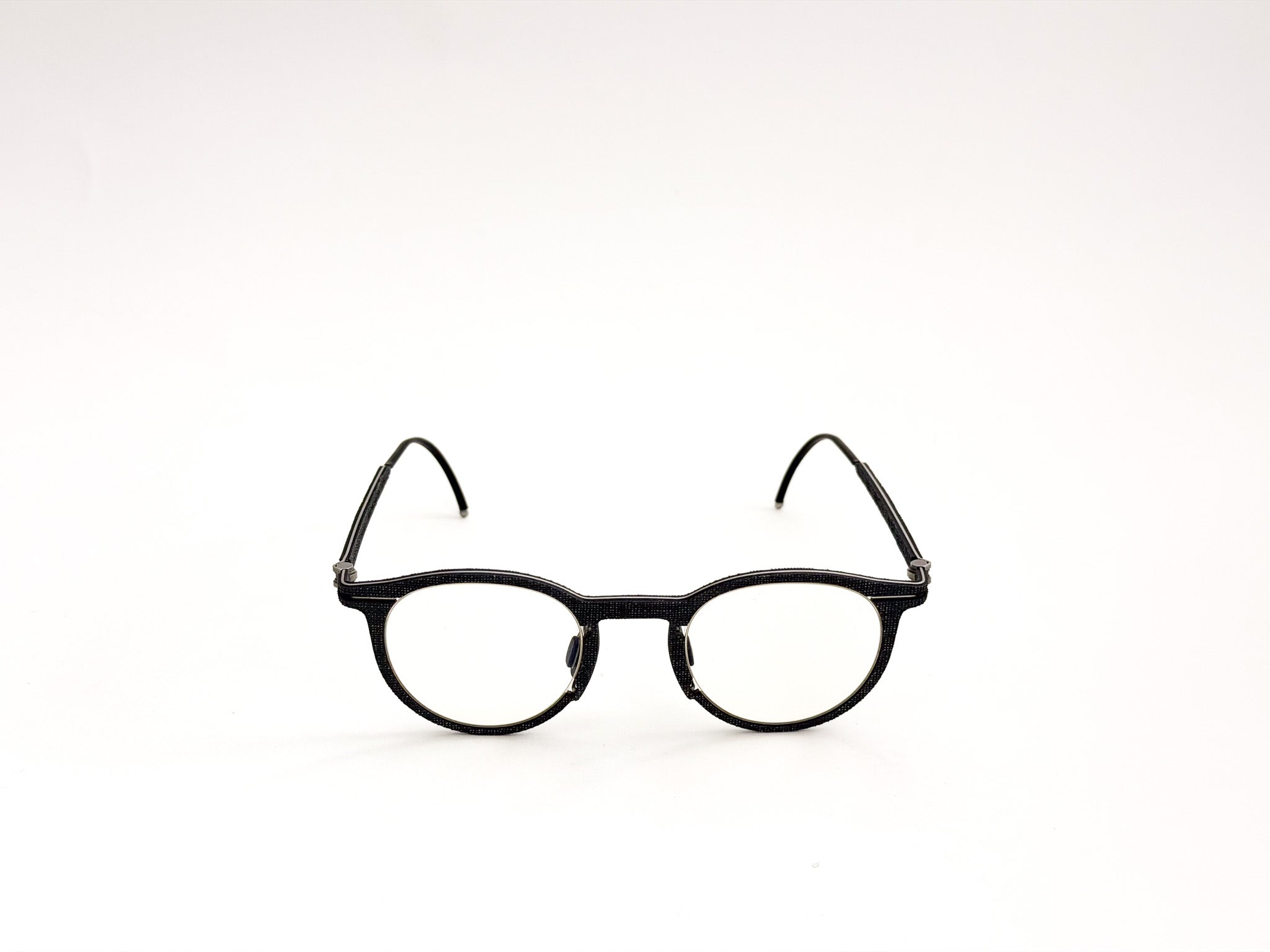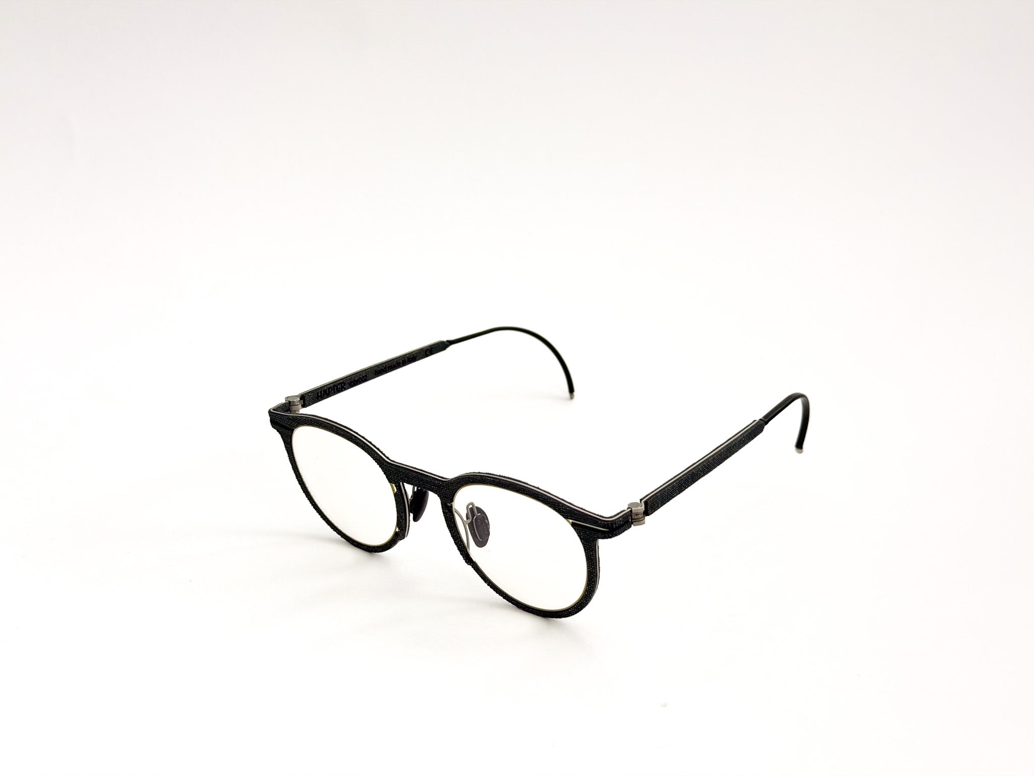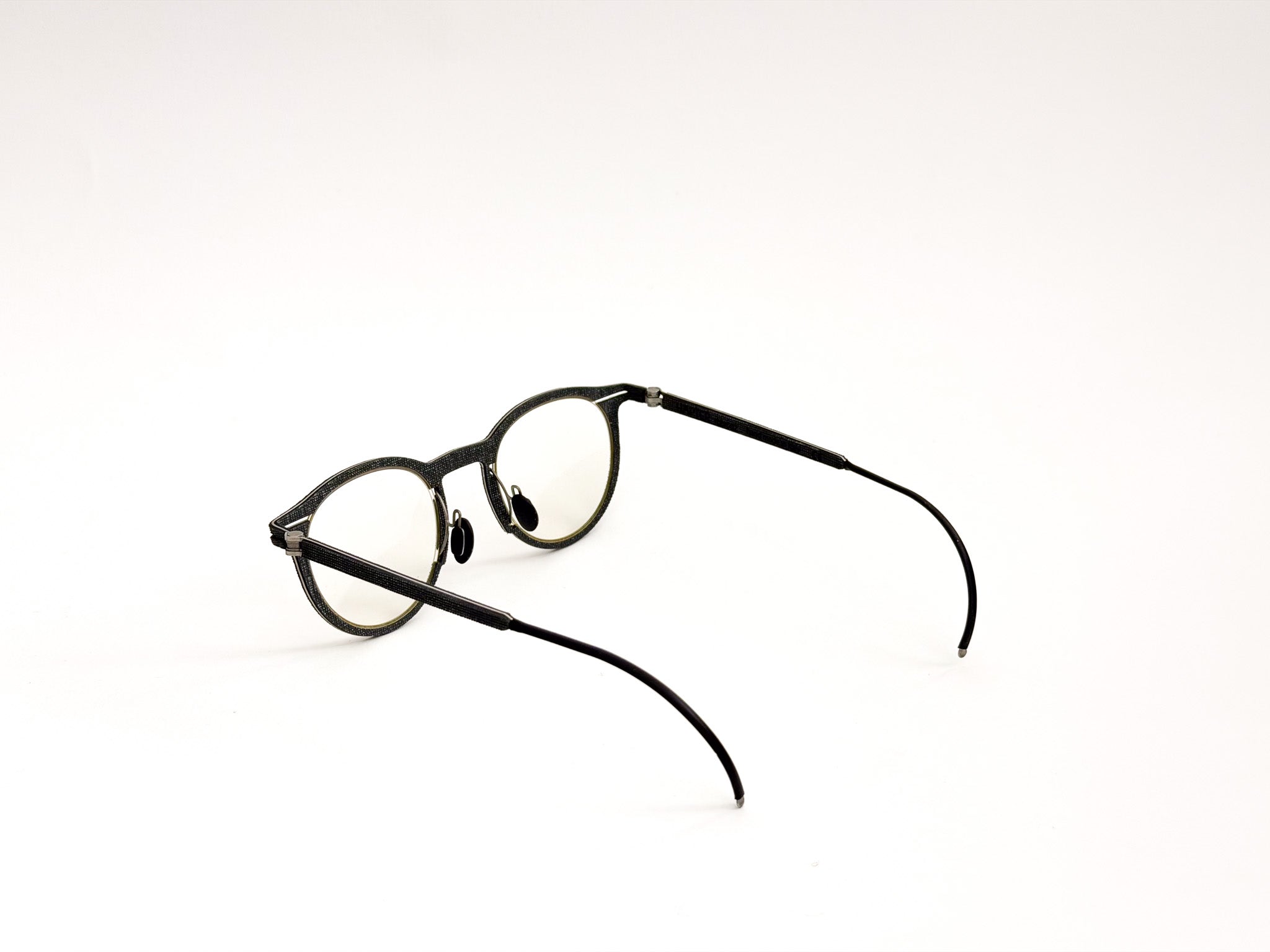 Hapter glasses are born from the fusion of precision engineering and contemporary craftsmanship. Each frame is milled from a single block of surgical stainless steel, without screws or hinges, to ensure maximum strength, lightness, and a clean, unmistakable design. This ultra-technical structure is woven with fine fabrics, such as wool and cotton from historic Italian wool mills (e.g., Cerruti 1881), and industrial organic rubber, molded and pigmented by hand to create unique textures. The result is a pair of glasses with an authentic and sophisticated character, where every detail is carefully considered, crafted, and finished.